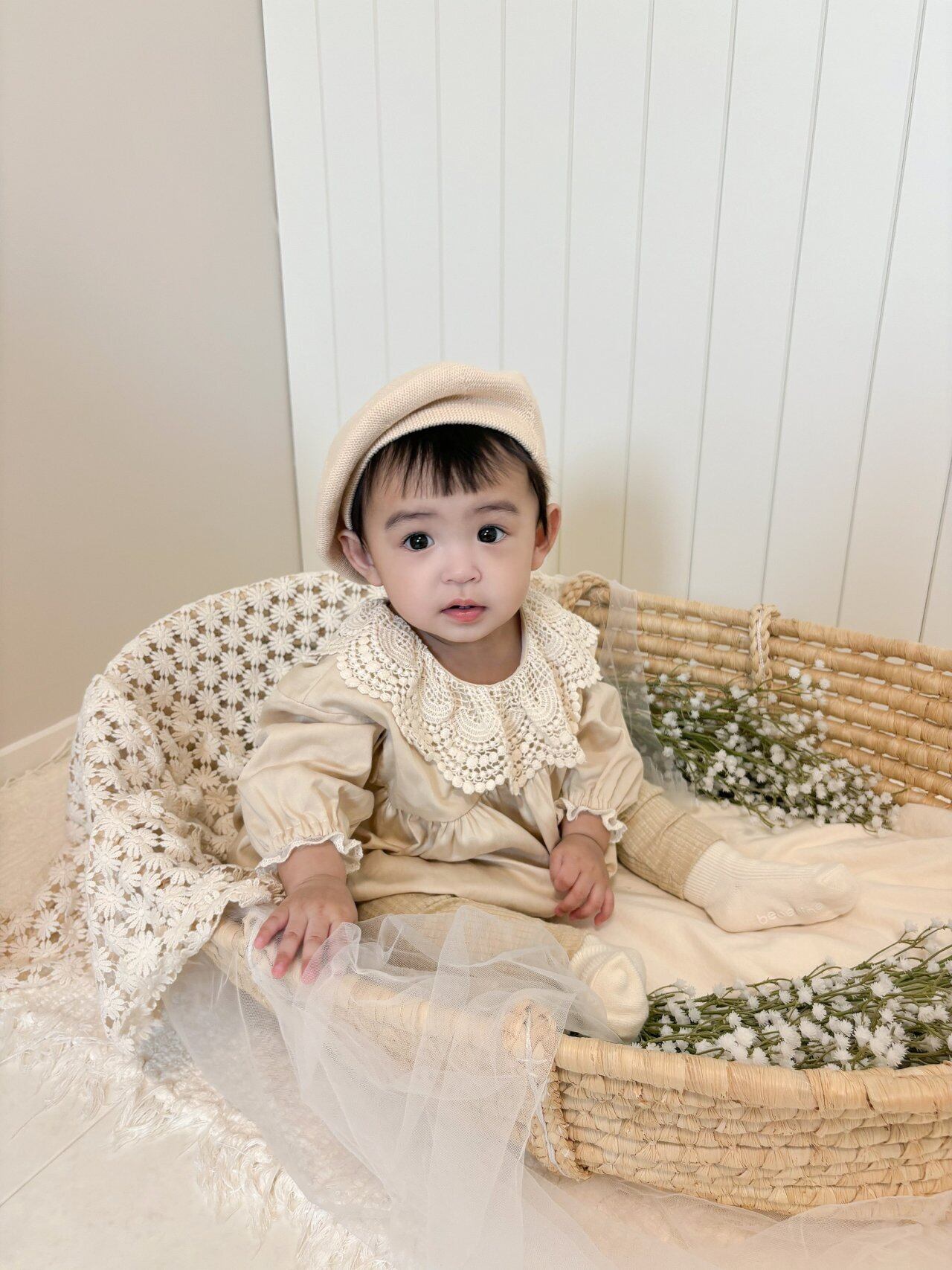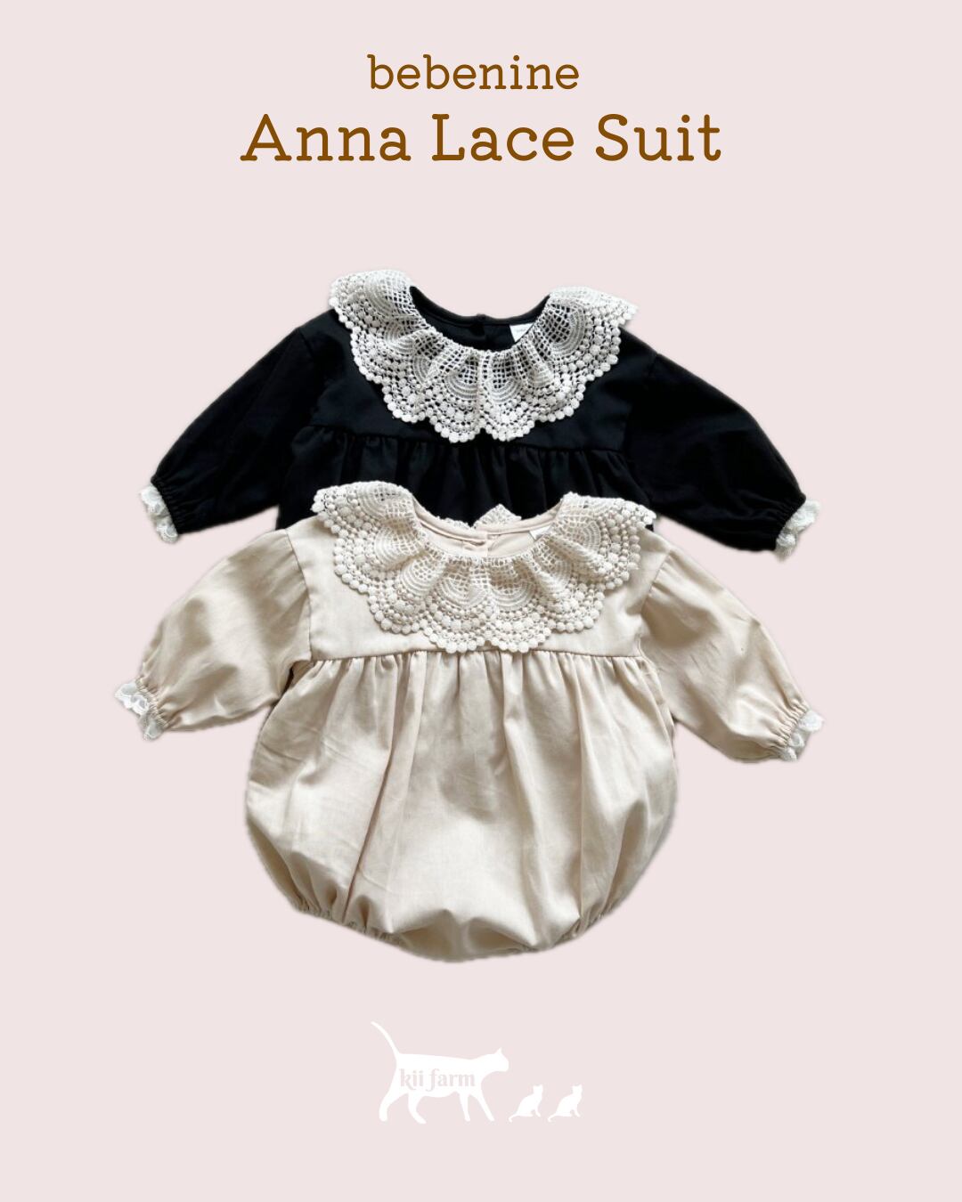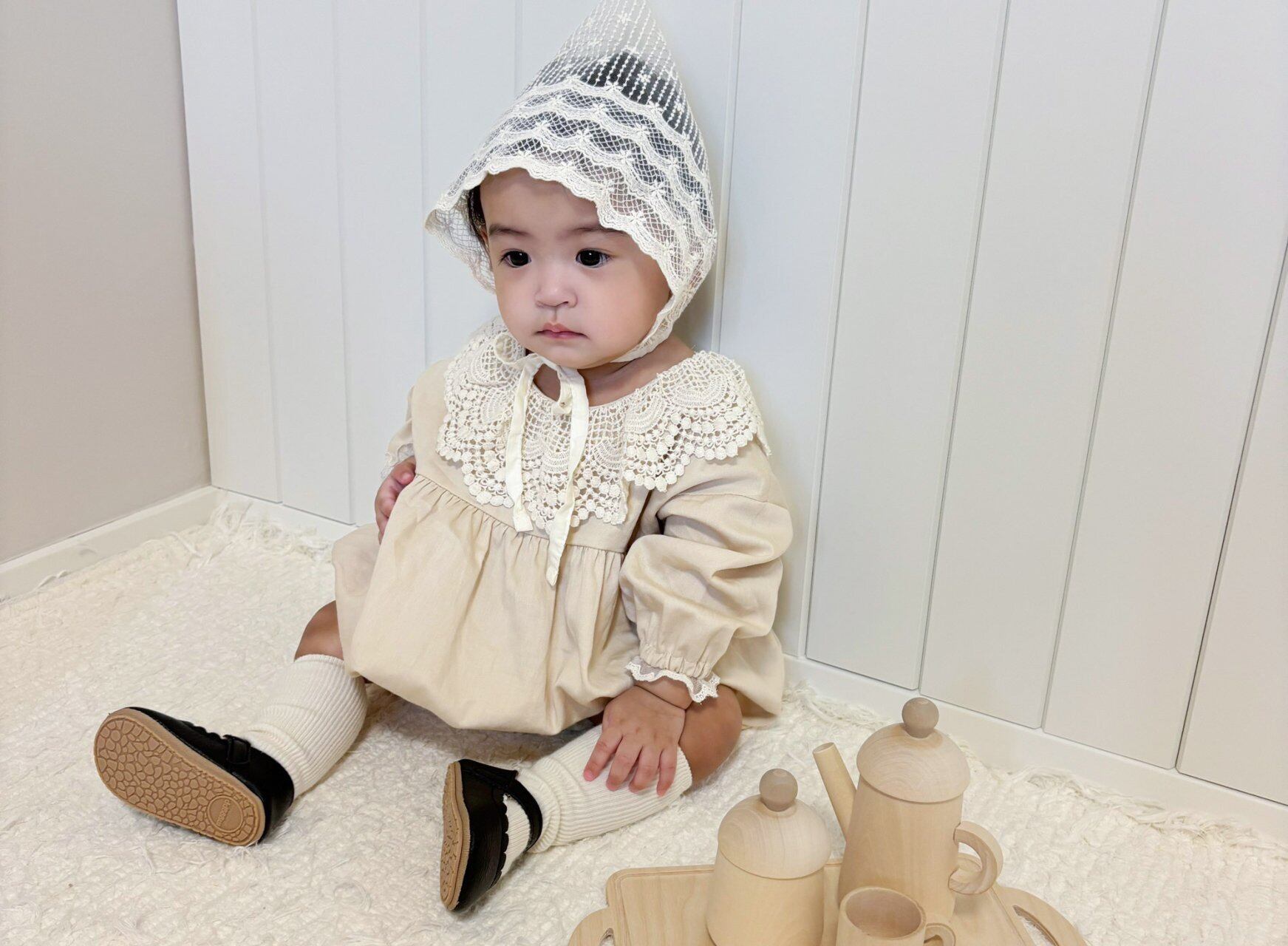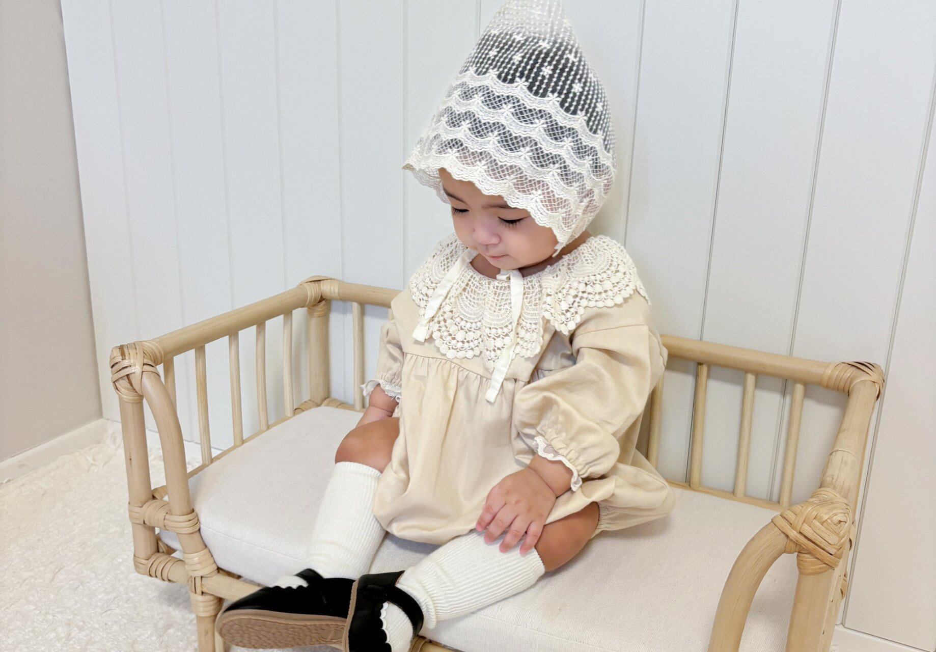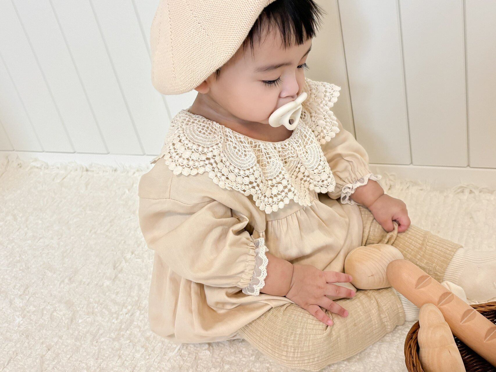 襟がとっても繊細なレースでできていて他にはない襟のデザインが特徴的なロンパースです!形も色味もお上品な1着です♡